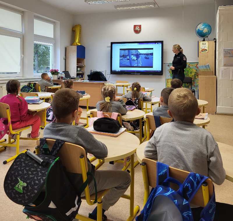 Šiandien mūsų pirmokėlius aplankė Šalčininkų rajono PK bendruomenės pareigūnė Olga Jasiukaitė. Ji papasakojo vaikams apie saugų elgesį kelyje, pamokė, kaip taisyklingai pereiti gatvę per perėją, kaip saugiai važiuoti automobilyje ir autobuse, paaiškino, kodėl svarbu segėti atšvaitus.