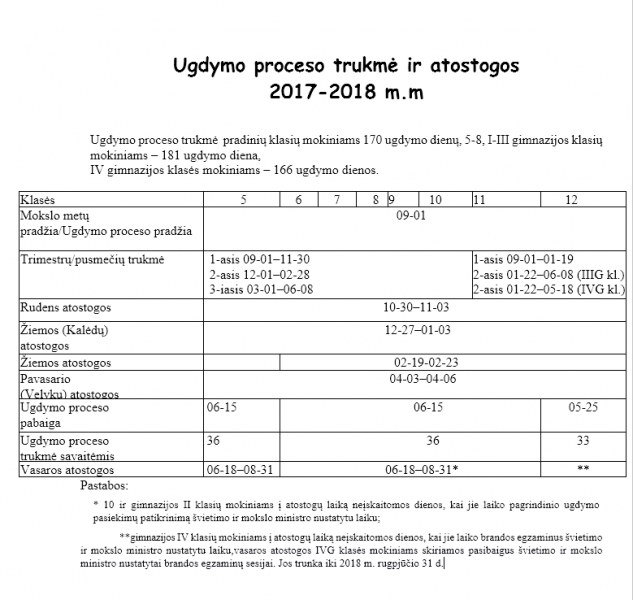 Ugdymo proceso trukmė, atostogos