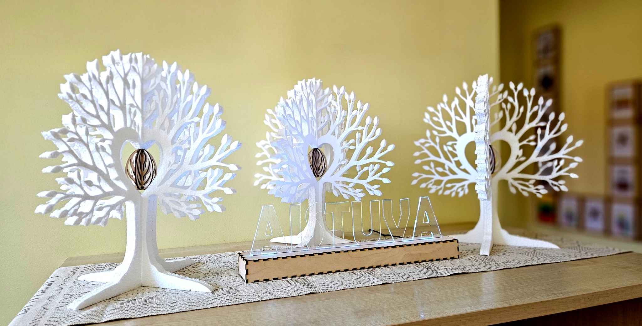 Baltų medžių kompozicijos simbolizuoja gyvybę, augimą ir bendrystę, o rankų darbo dekoracijos primena, kaip svarbu puoselėti tradicijas ir kūrybiškumą.